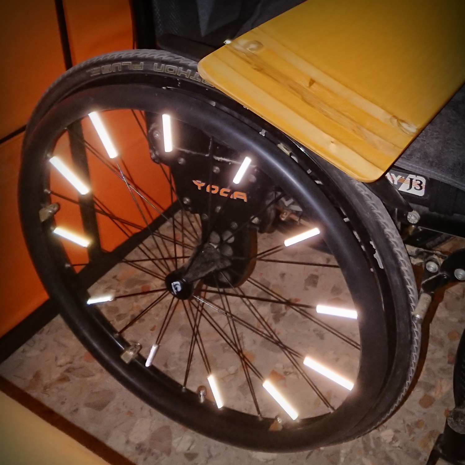 Ho comprato uno scotch e delle bacchette catarifrangenti, da mettere sulle ruote. Per avere maggiore visibilità, si possono mettere anche le luci a batteria, utili per farsi vedere, ma anche per illuminare la strada, davanti a noi. Più che la strada le buche, in effetti…