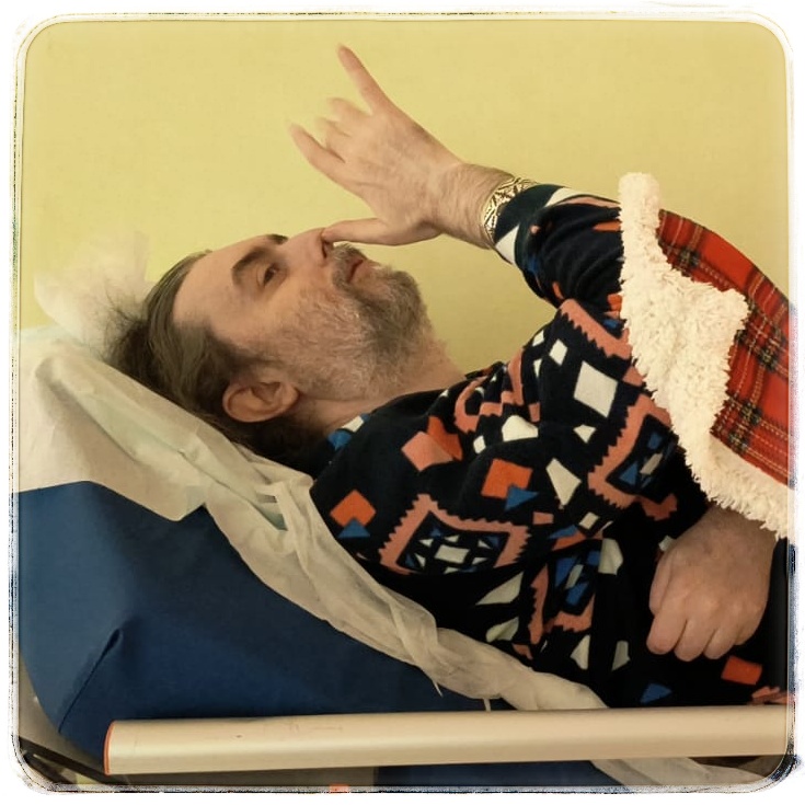 Abbiamo passato i vari momenti di attesa tra un controllo e l’altro in una camera con altre persone. Un anziano, non volendo stare sdraiato col catetere, se lo è sfilato più volte cercando di urinare contro il muro, alzando curiosamente la gamba come un cane. Ovviamente la moglie (la brutta copia di Shirley Temple con gli occhi di Bette Davis e la voce di Shrek, in quanto fumatrice) cercava di calmarlo mentre un’infermiera, entrando di corsa, gli urlava di fermarsi. Questa scenetta si è ripetuta più volte. I due coniugi, molto ruspanti di aspetto, modi e parlantina, ci facevano ridere così tanto che la mia compagna (lei che poteva) è dovuta uscire dalla stanza più volte in preda alle risate! Di lì a poco, è stato portato in corsia dai carabinieri un ragazzo di colore che, con accento calabrese, ha urlato “aiuto!” per ore.